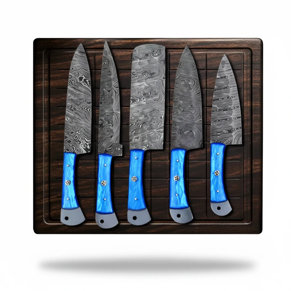This Handmade 5 PCS Best Chef Knife Set is a professional-grade collection crafted from high-quality Damascus Steel, featuring the material’s distinctive layered patterns. The set includes five essential kitchen knives, meticulously hand-forged for a razor-sharp straight edge and long-lasting durability.